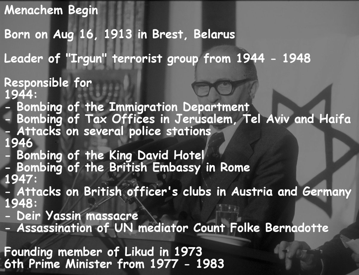 In 1948 Menachem Begin was the most wanted terrorist in British Mandated Palestine and MI5 even put a GBP 10,000 bounty on his head.