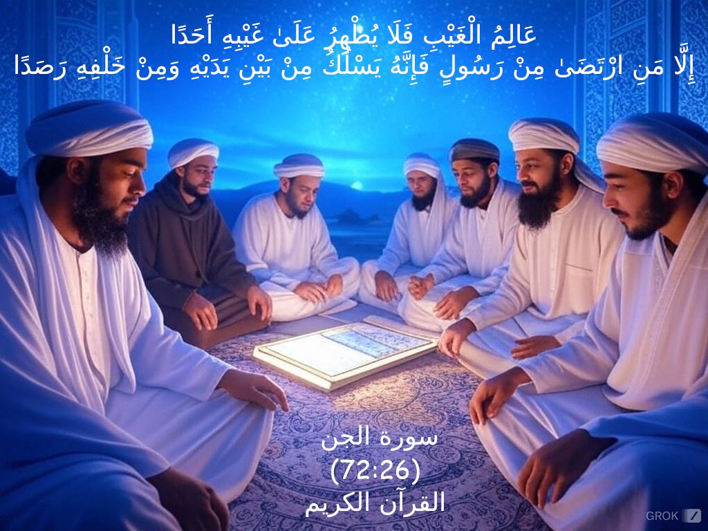عَالِمُ الْغَيْبِ فَلَا يُظْهِرُ عَلَىٰ غَيْبِهِ أَحَدًا إِلَّا مَنِ ارْتَضَىٰ مِنْ رَسُولٍ فَإِنَّهُ يَسْلُكُ مِنْ بَيْنِ يَدَيْهِ وَمِنْ خَلْفِهِ رَصَدًا -- القرآن الكريم، سورة الجن (72:26)
