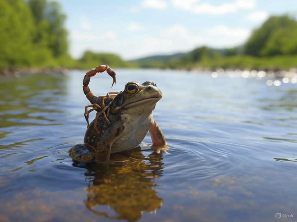 A scorpion wants to cross a river but can’t swim, so it asks a frog to carry it across on its back. The frog hesitates, saying, “But you’ll sting me, and I’ll die.” The scorpion reassures the frog, pointing out that if it stings the frog, they’ll both drown. Convinced by this logic, the frog agrees. Halfway across the river, the scorpion stings the frog anyway. As they both start to sink, the frog asks, “Why did you do that? Now we’ll both die!” The scorpion replies, “I couldn’t help it—it’s in my nature.”