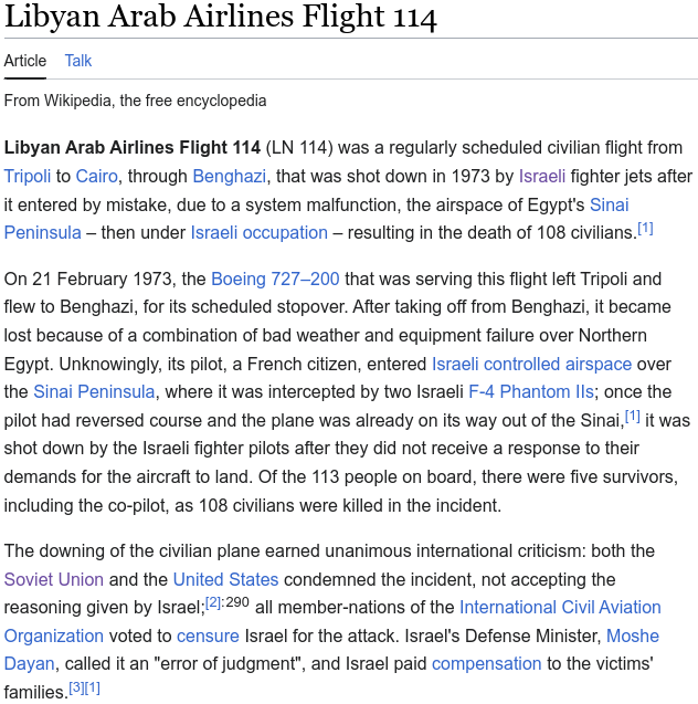 Israeli terrorists shot down Libyan Arab Airlines Flight 114.